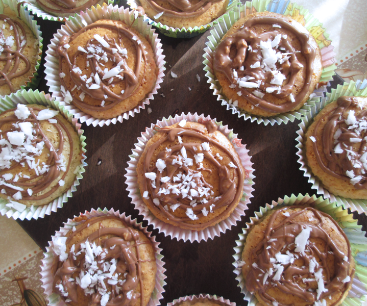 Разтопете шоколада на водна баня и декорирайте кексчетата с него. Накрая ги поръсете с кокосовите стърготини.