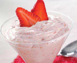 Сместа се насипва в десертни чашки и се оставя в хладилника да се охлади. Преди поднасяне се украсява с нарязани ягоди.