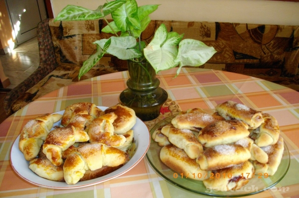 От продуктите месим тесто и оставяме да втасва, после го делим на 2 части и всяка част се точи на лист. Режем на триъгълници, слагаме сладко или течен шоколад, завиваме като кифла, отгоре намазваме с разбито яйце и посипваме със захар.