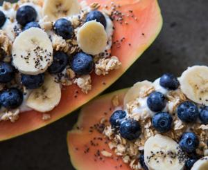 Папаята се разрязва на две половини. Семките се махат и с лъжица се издълбава вътрешността за да се освободи място за пълнежа. Всяка половина се напълва с кисело мляко, боровинки, банан и овесени ядки. Полива се с мед и се поръсва с чиа.
