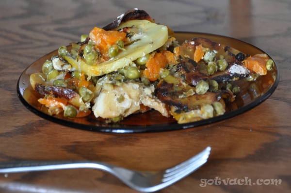 В намазнена с олио тавичка се слагат грахът и морковите. Поръсват се със ситно нарязания лук. Отгоре се разпределят рибните филета, подправят се със ситно нарязания магданоз, лимонов сок и парченца лимон, сол и черен пипер. Покрива се с нарязаните на тънки филийки картофи.  Залива се със зеленчуковия бульон, поръсва се с брашното и се пече 15 минути.