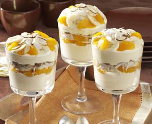В отделни десертни чашки се сипва пудинг (до половината на чашката), слага се пласт от нарязания на кръгчета банан, парченца мандарина, кокосови стърготини и бадеми. Така слоевете се редуват, докато чашките се напълнят.