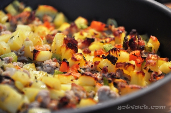 Каймата с яйцето, хлябът (предварително накиснат във вода и отцеден) и подправките се омесват добре. Получената смес се разстила в намазнена тавичка. Върху този пласт се редят плътно опечените и обелени чушки. Върху тях се натрошава сиренето. Ястието се запича леко и се залива с разбитите яйца, брашно и кисело мляко, след което се връща във фурната за малко.