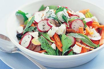 Салатата се разбърква добре, оформя се в подходяща чиния и се украсява с репичките, почистените от костилките сливи и стръкчета копър.