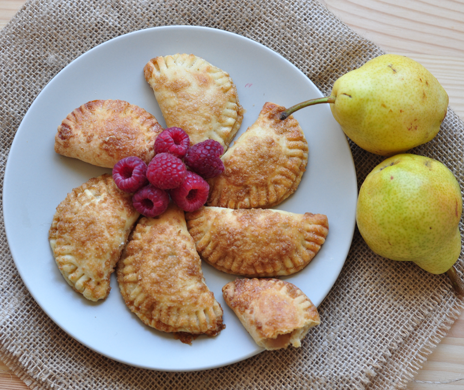 Когато крушите са готови, с малка лъжичка се гребват няколко парченца круша и сос и се слагат в центъра на всяко кръгче. Прегъва се на две и краищата се притискат с вилица, за да се получи характерната шарка. Всяка сгъната и притисната с вилица торбичка се намазва с четка със сметана и се посипва с кристали кафява захар.