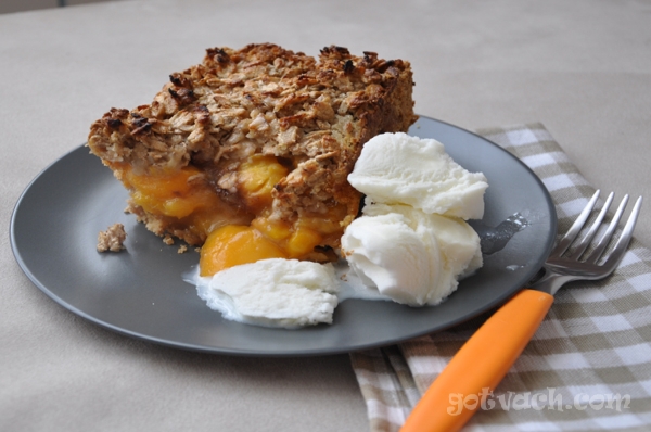 Прасковената смес се изсипва върху предварително изпечената кора. За заливката се смесват овесените ядки, кафявата захар, млякото и брашното. Прибавя се и маслото и се разбърква. Изсипва се върху пълнежа от праскови и се пече на най-висока температура за 25-30 минути или докато стане златисто кафяво.