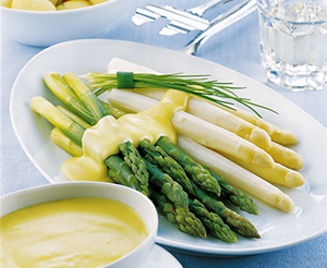Sauce Bavaroise is hollandaise with added cream, horseradish, and thyme.