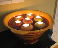 В голяма купа напълнена с вода, сложете ябълки със закрепени свещички на върха (повтаря се процедурата както с малките тиквички). Това е чудесна украса за масичката за кафе.