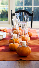 Използвайте мънички тикви като свещници. С остър нож изрежете стеблата им така, че горната част да остане плоска. Задръжте свещ над тиквата и очертайте с молив около нея. Изрежете дупка по очертанията, трябва да е толкова дълбока, колкото да успеете да закрепите свещта вътре, без да има опасност тя да падне. След това закрепете свещта вътре. Подредете няколко по дължината на масата. За елегантен вид, оцветете тиквите със спрей в един цвят.