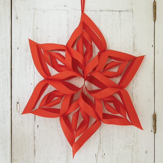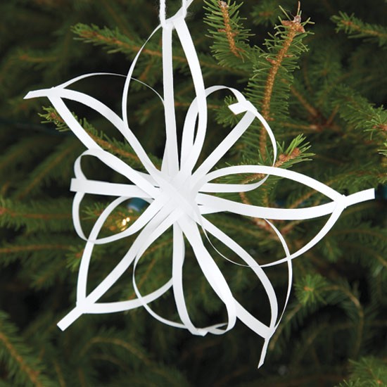 3) Сега трябва да събереш двете половинки. Постави едната върху другата, като завъртиш горната на 45 градуса, така че две залепени лентички да срещнат една самостоятелна лентичка. Върхът на самостоятелната лентичка се залепва за върха на двете залепени, като се остави 1.5 см от лентичката да стърчи. Завържи с панделка или конец, за да я закачиш на елхата.