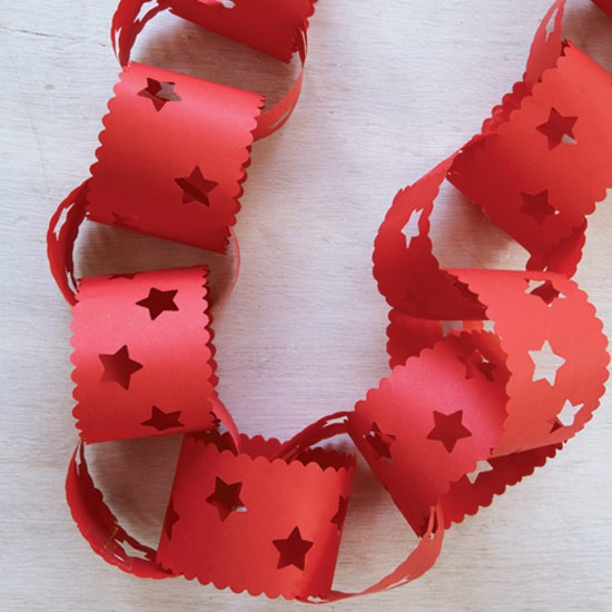 1) Използвайки ножицата отрежи лентички с ширина 5 см. Перфорирай тук-там със звездичките, оставяйки 4-5 см между всяка звездичка. Продължи да правиш тези стъпки, докато събереш достатъчно лентички, с които да направиш верижка.