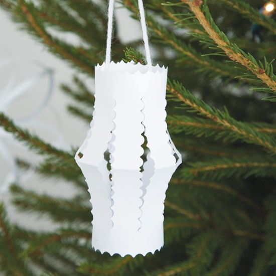 3) Разгъни листа и го навий на руло по дължина. Залепи двете страни, и лекичко притисни горната и долната част, за да се издуе като истински фенер. Закачи панделка или конец.